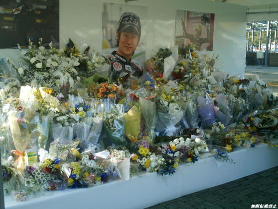 その当日ツインリンク茂木に展示されていた実物のヘルメットと献花台↓